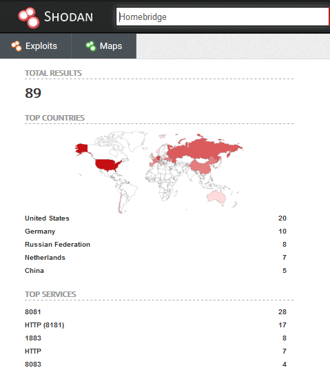 Homebridge Config UI X is a web based management tool for Homebridge that allows you to manage all aspects of your Homebridge setup. Around 90 instances show on on Shodan – masscan port 8081 and 8181 may reveal more.