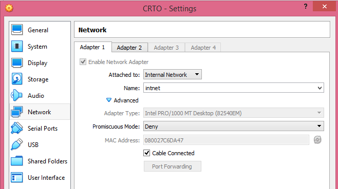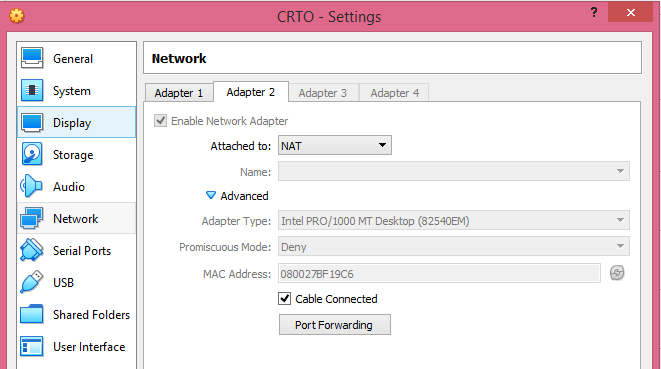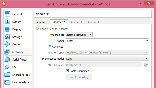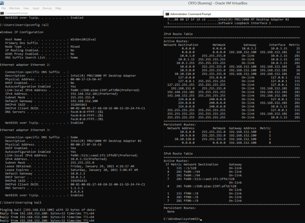 If you have issues to configure the Windows VM within Virtual Box, the following is my configuration that works as intended in the course. You may need to play with route add and route delete to adjust the route table, and to make sure the Virtual Box Network card settings match the Windows network cards as shown in the image: