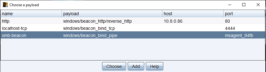 [*] Tasked beacon to spawn windows/beacon_bind_pipe (\\.\pipe\msagent_94fb) in a high integrity process (token duplication)