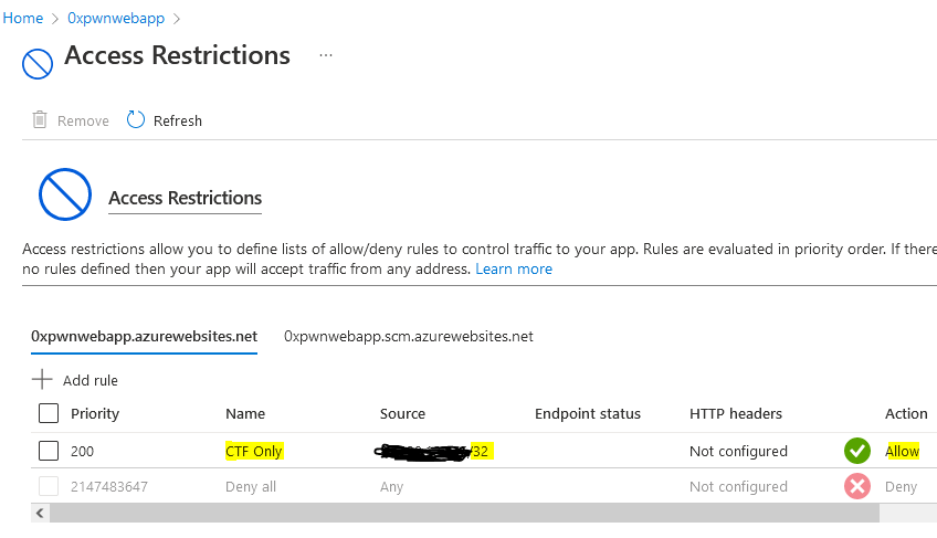 Lastly, since this is a web application that gives command execution to anyone, it would be wise to restrict the access and only allow traffic coming from our IP address. Using the “az webapp config access-restriction” we add a firewall rule