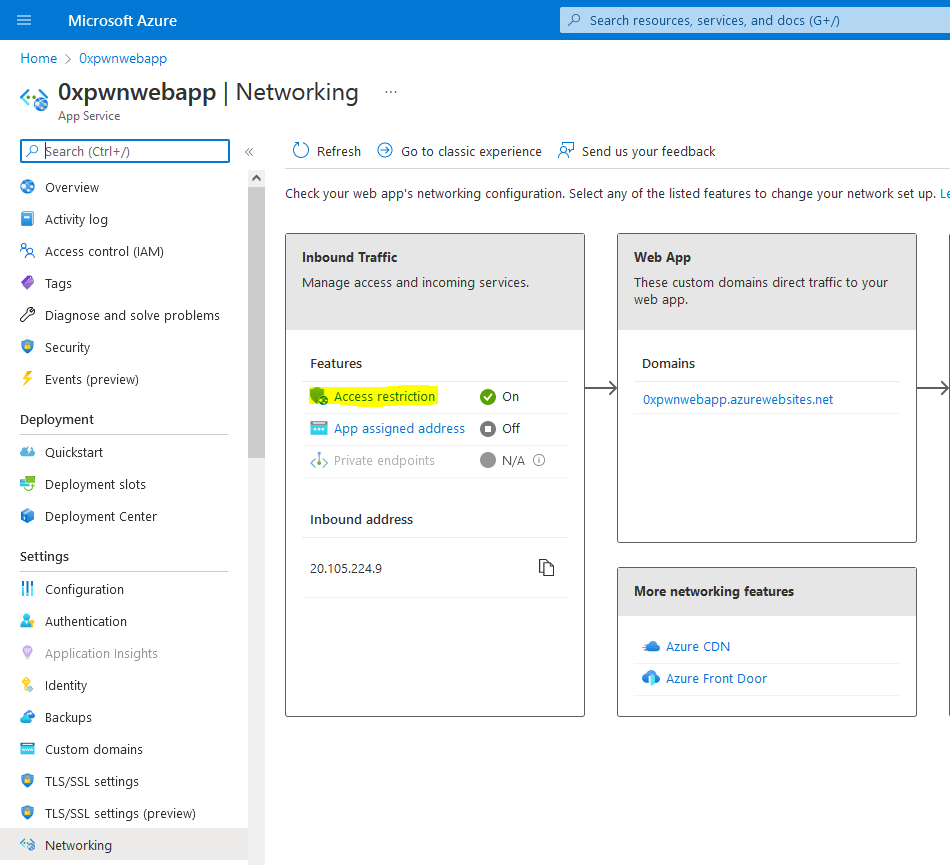 To check if this worked, we can go to Azure portal under our App Service -> Settings -> Networking -> Access Restriction