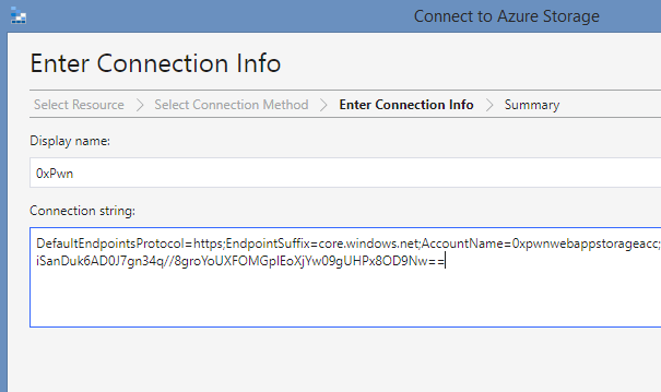 And we paste the value of the conn_str variable that we found in the source code, and connect: