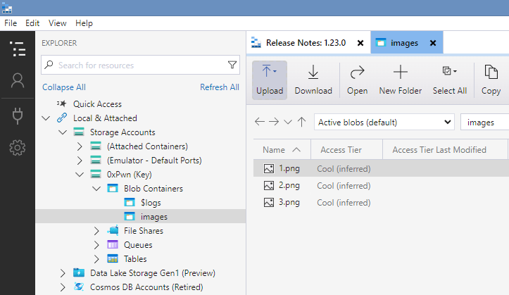 On the left side menu, a new storage account should show up. Navigate to the Blob Containers -> images and open it: