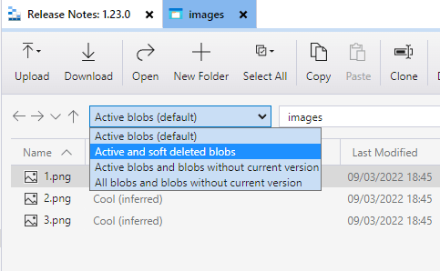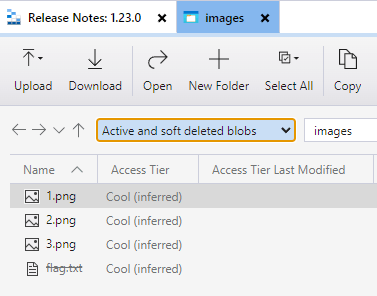 At first glance, it seems that nothing of interest is stored here. Remember the flag that we accidentally uploaded? Change the view to Active and soft deleted blobs:
