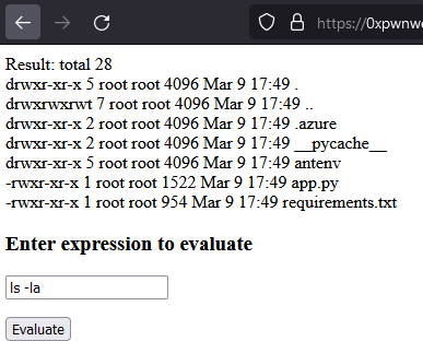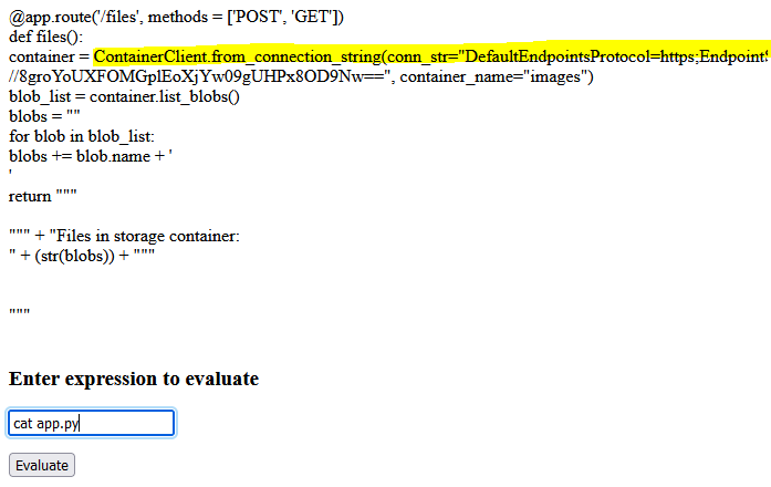 Now, to exploit this vulnerability we navigate to the already known vulnerable web application and start poking around. Listing the files in the current directory, we can find among other the source code in the app.py: