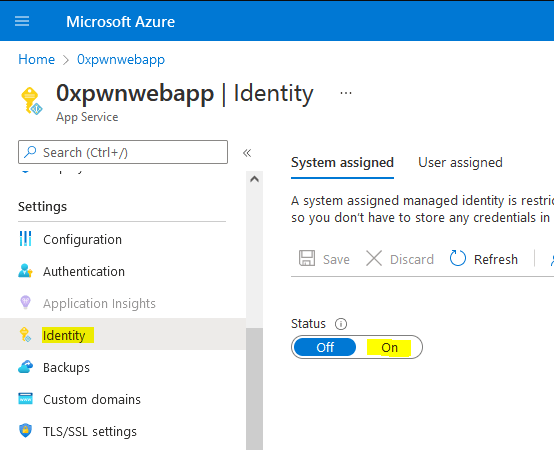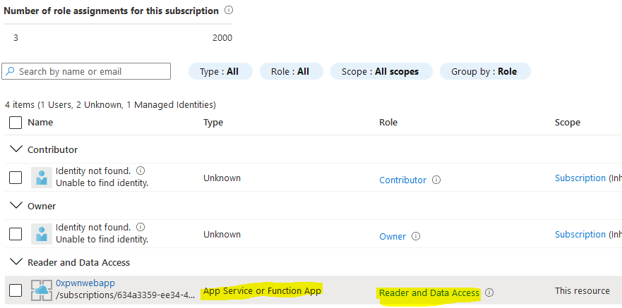 After we deploy the app and configure the “CTF” firewall such that is only access from our IP address, we assign the Managed Identity to the web application. As shown earlier, we will give our web app the “Reader and Data Access” role: