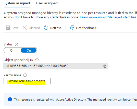 Once enabled, we are given the possibility to configure the roles assigned for this identity (i.e: permissions granted to the service that we enabled the identity for).