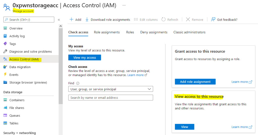 Similarly, to see who has permissions granted for a give resource, we can check that under the Access Control (IAM) -> View access to this resource.