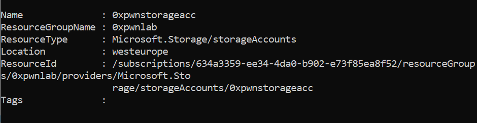 >Get-AzStorageAccountKey -ResourceGroupName "0xpwnlab" -AccountName "0xpwnstorageacc"
