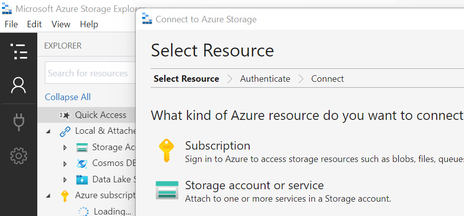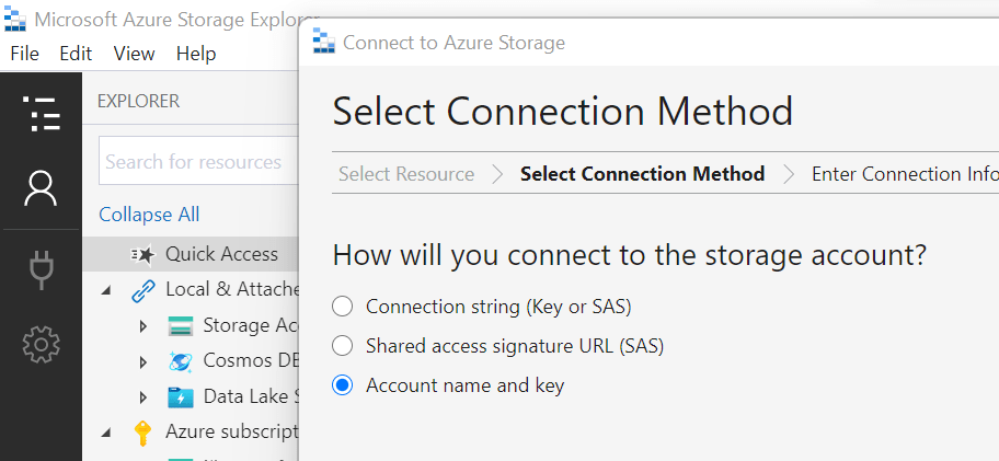 If the command returns two keys, than it means that our identity had permissions to list them. Let’s use these keys in azure storage explorer and see if there are other containers stored on the same account. In the azure storage explorer, we click the connect icon and select storage account or service