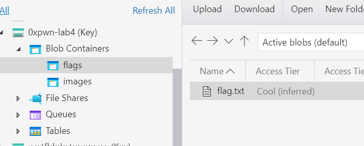 Once we connect, on the left side menu we should find a new storage account, we 2 containers: the images container used by the web app, but also a new one containing the flag.