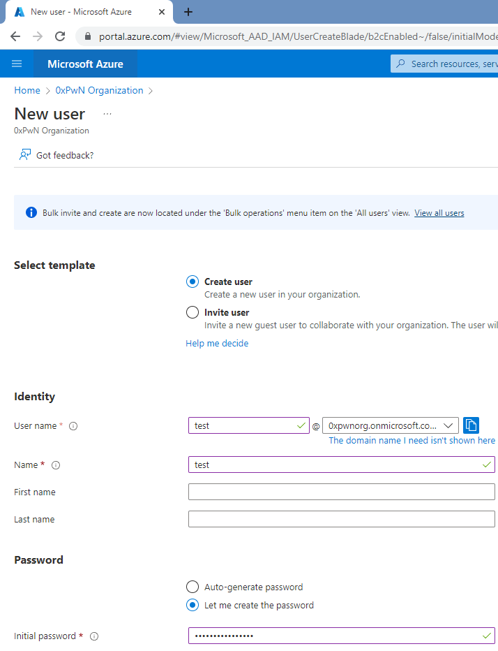 For the password spraying attack, we will use the “Let me create the password” option and set it to “0xPwn0xPwn!!!123” – we will use this to demonstrate how a successful attack looks.