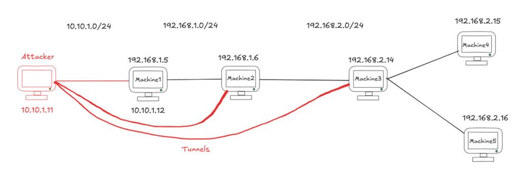 The red paths in the figure represent the tunnels used for this purpose. Using the same concept, we can compromise Machine2 and then use it to gain access to Machine3, Machine4, and Machine5.
